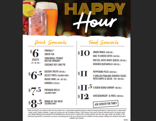 Happy Hour Times MON - FRI: 4-7 PM TUES: ALL DAY DAILY: 9PM-CL